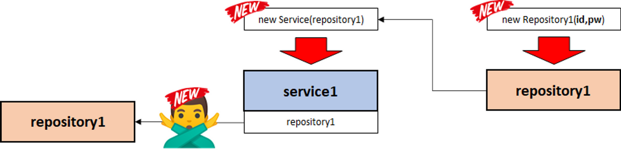 -> Repository1 객체 생성 시 DB 접속 id, pw 를 받아서 DB 접속 시 사용, 생성자에 DB 접속 id, pw 를 추가