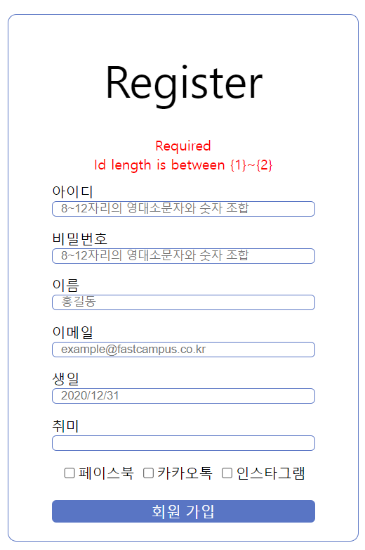 //User객체를 검증한 결과 에러가 있으면, registerForm을 이용해서 에러를 보여주어야 한다.