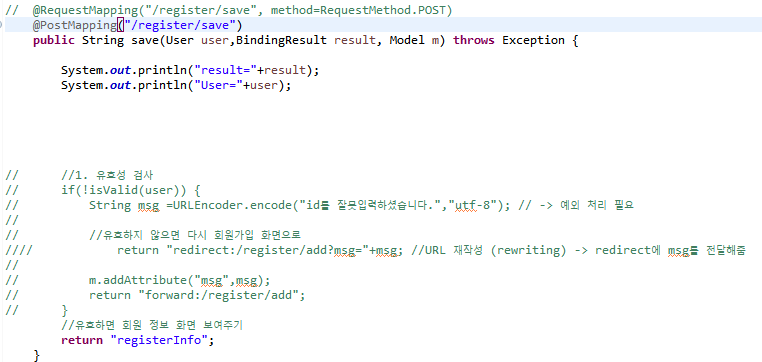 유효성검사를 컨트롤러에서 하지 않고, 따로 만들어주기 위해 주석처리를 한다.