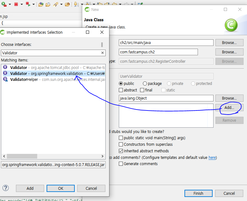 @InitBinder 어노테이션이 붙은 메소드에 binder에다가 setValidator로 UserValidator를 생성해서 지정해주면 된다.