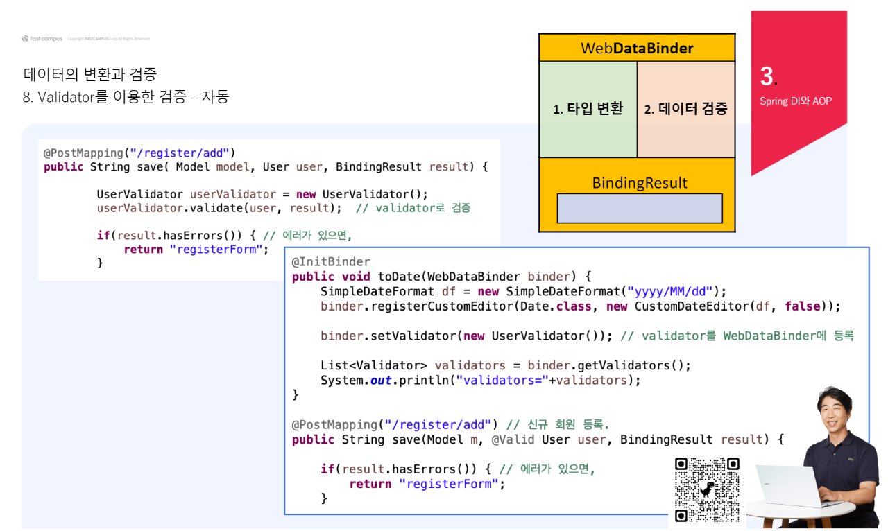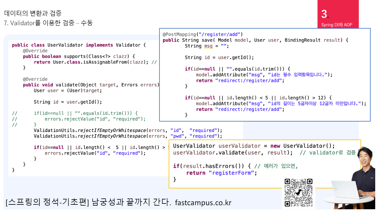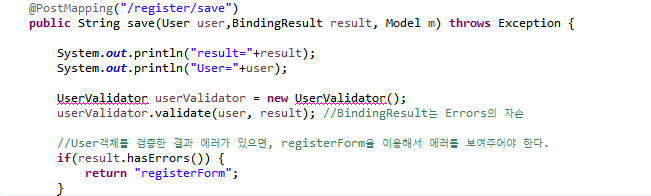 userValidator.validate(user, result); //BindingResult는 Errors의 자손 //검증을 한 뒤